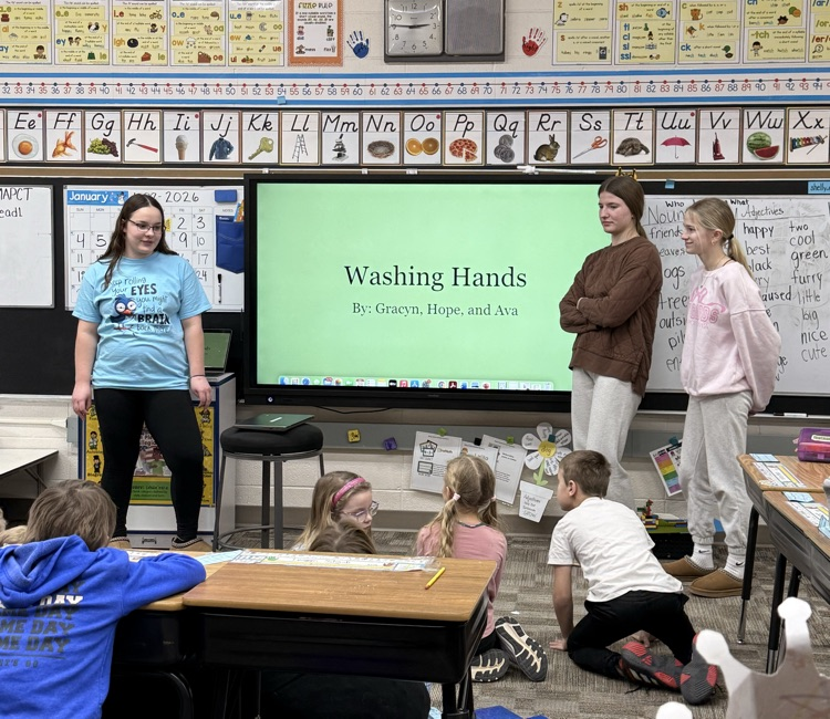 Hope Gross, Ava Bitz,and Gracyn Feist spent time in different elementary classrooms teaching a lesson on healthy living topics. Grades 1st through 5th, Kyle Friez was a guest speaker on street safety. Fifth graders did an activity on positive comments of their classmates.Third graders focused on healthy snacks. Sixth grade tried out some dance moves for exercising. Special thanks to all the students and especially the elementary teachers for letting us spent time with your classes!